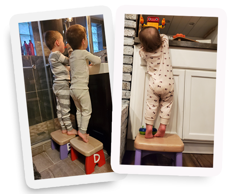 A step stool allows children to experience so many firsts — brushing their teeth on their own, climbing onto the couch to sit beside you, standing at the mirror, reaching the kitchen counter, grabbing their favorite storybook, or climbing into their own bed.